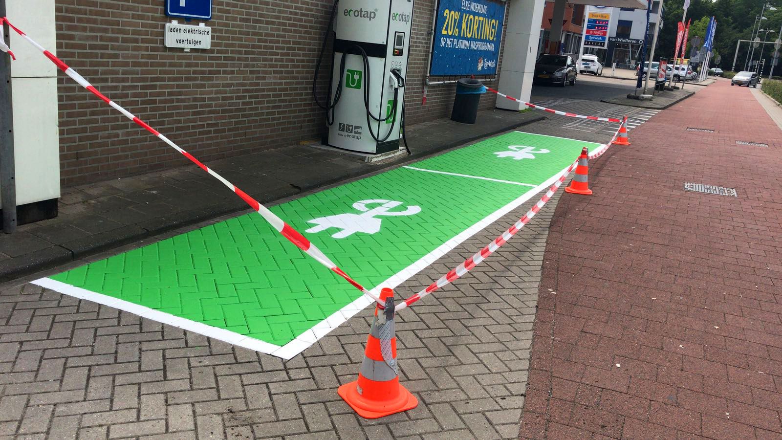 Wegmarkering oplaadpunt - groen parkeervak met belijning en symbool stekker