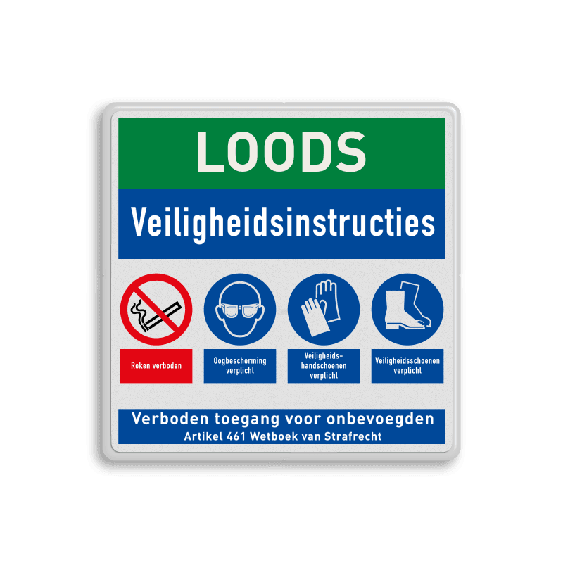 Veiligheidsbord voor loods met veiligheidsinstructies en PBM pictogrammen