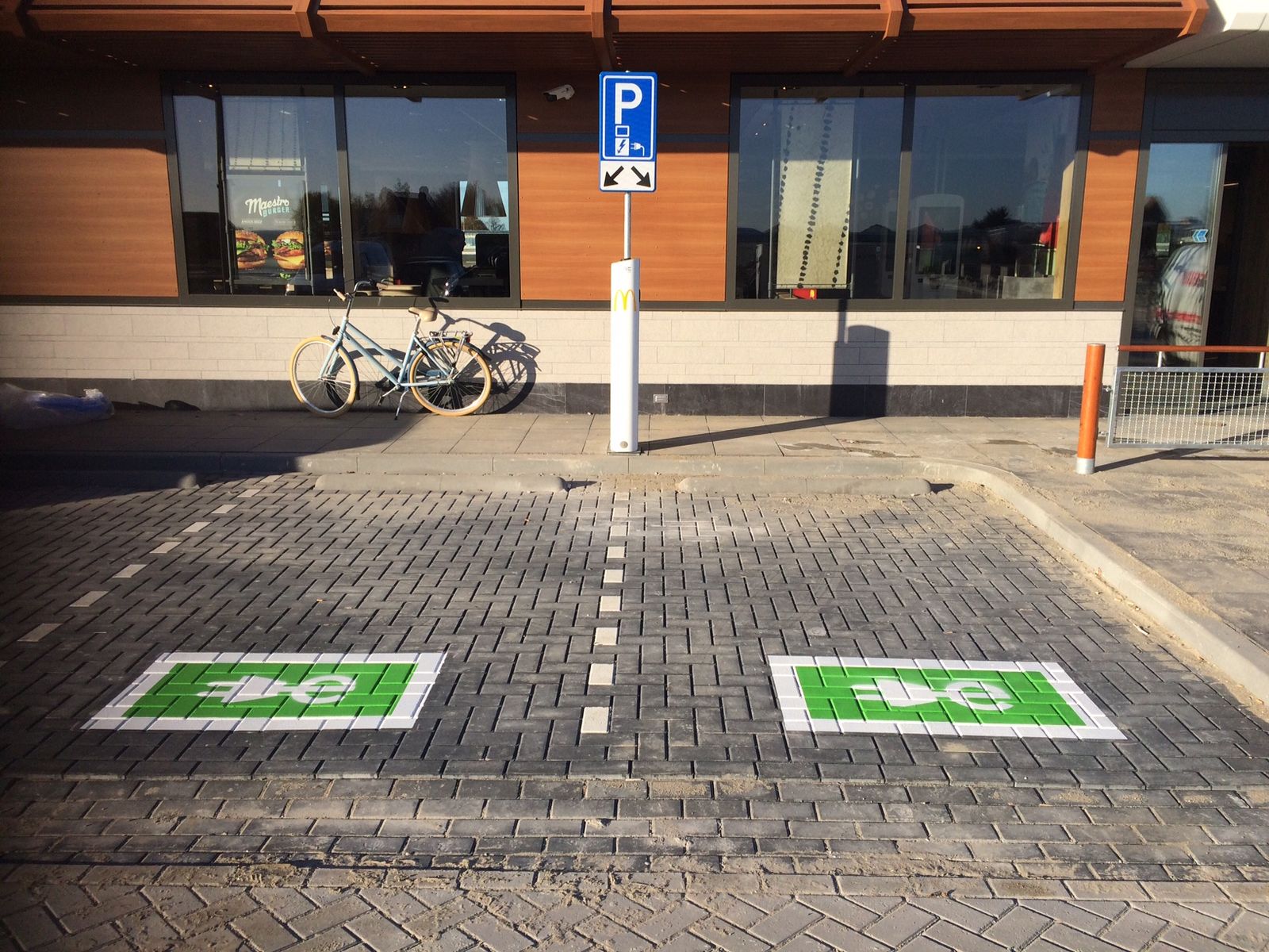 Markering uitgevoerd in een speciale wegenverf coating met een afmeting van 1.200 x 700 mm., een wit E-laad logo aangebracht op een gekleurde ondergrond en voorzien van witte belijning rondom het geheel.
