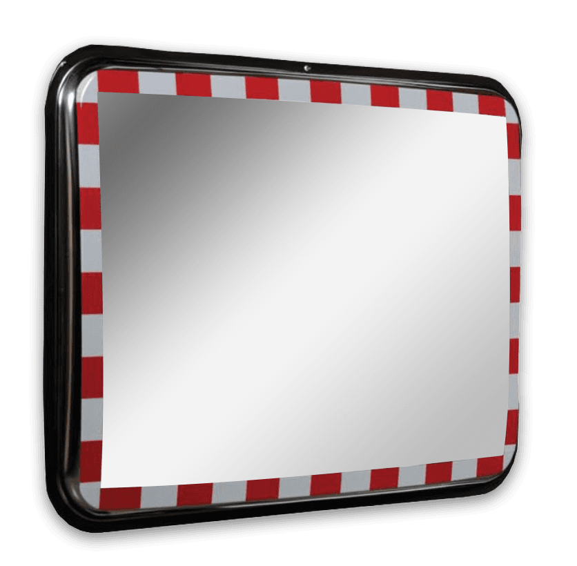 • helder onbreekbare roest-vast-stalen spiegel; superscherp beeld met reflecterend kader rood/wit
